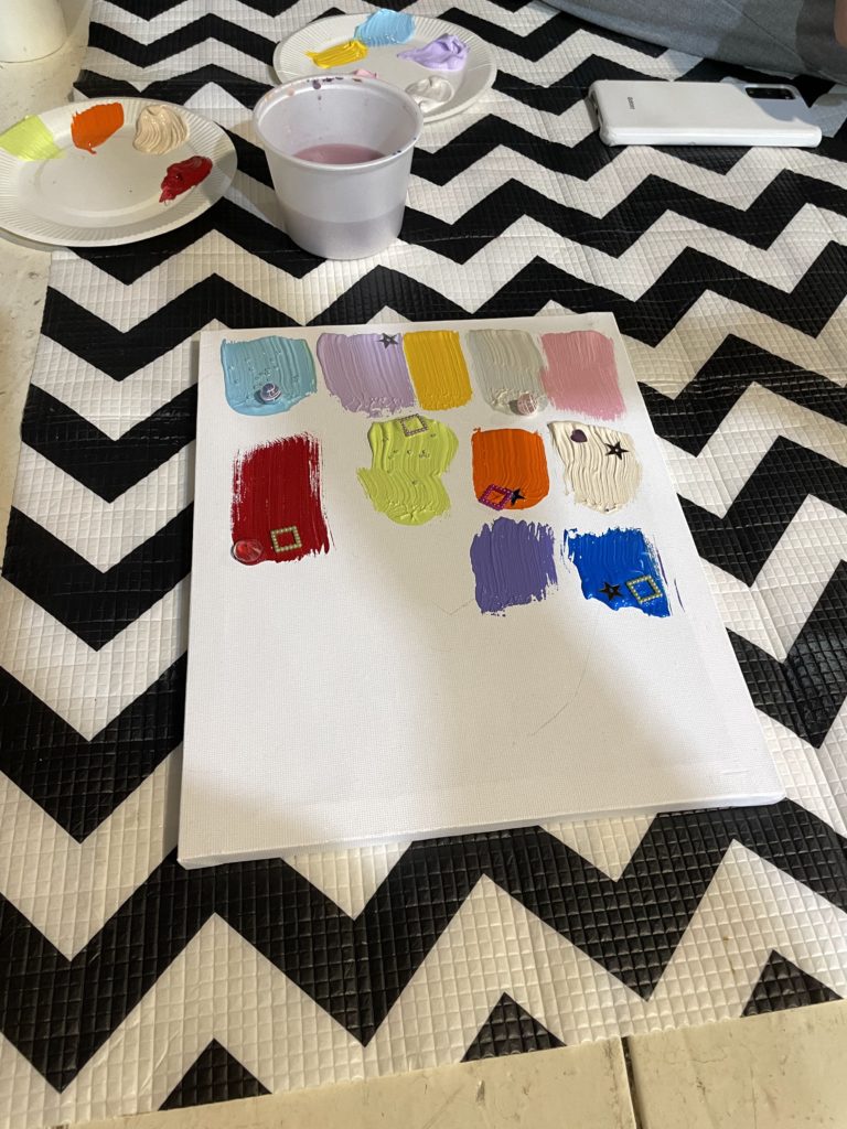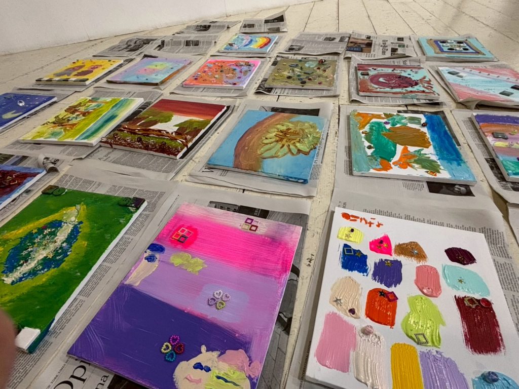 子どもたちが、アクリル絵の具🖌️やカラフルなビーズでキャンバスをデコレーションし、それぞれ思い思いの1枚を仕上げました。